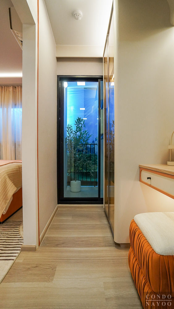 มองกลับออกมาจะเห็นพื้นที่ Walk-in Closet ที่อยู่เชื่อมต่อกัน และถัดออกไปด้านหลังจะเป็นระเบียงซักล้าง ที่แยกโซนด้วยประตูกระจกบานเลื่อน 1 ฝั่ง
