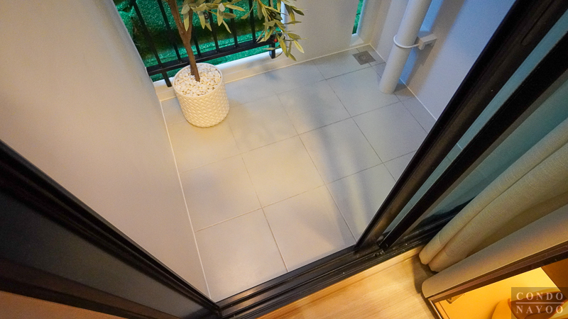 ระเบียงมีขนาดพอเหมาะ สามารถวางราวตากผ้า หรือตกแต่งสวยเล็ก ๆ เพิ่มได้ ตัวพื้นปูกระเบื้องเซรามิกกันลื่นสีเทา 30 x 30 ซม. ให้เต็มพื้นที่