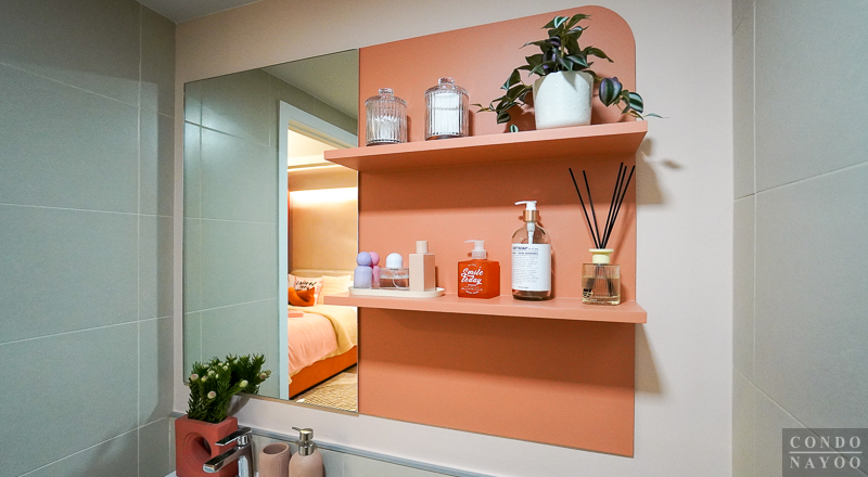 ผนังด้านหลังเป็นผนังฉาบเรียบทาสีชมพูอ่อน ติดกระจกเงาทรงเหลี่ยมให้ 1 บาน ด้านข้างที่เป็นชั้นวางของเป็นการตกแต่งให้ดูเป็นไอเดีย ซึ่งลูกค้าสามารถซื้อชั้นวางของในแบบที่ชอบมาติดเพิ่มเองภายหลังได้เหมือนกันค่ะ