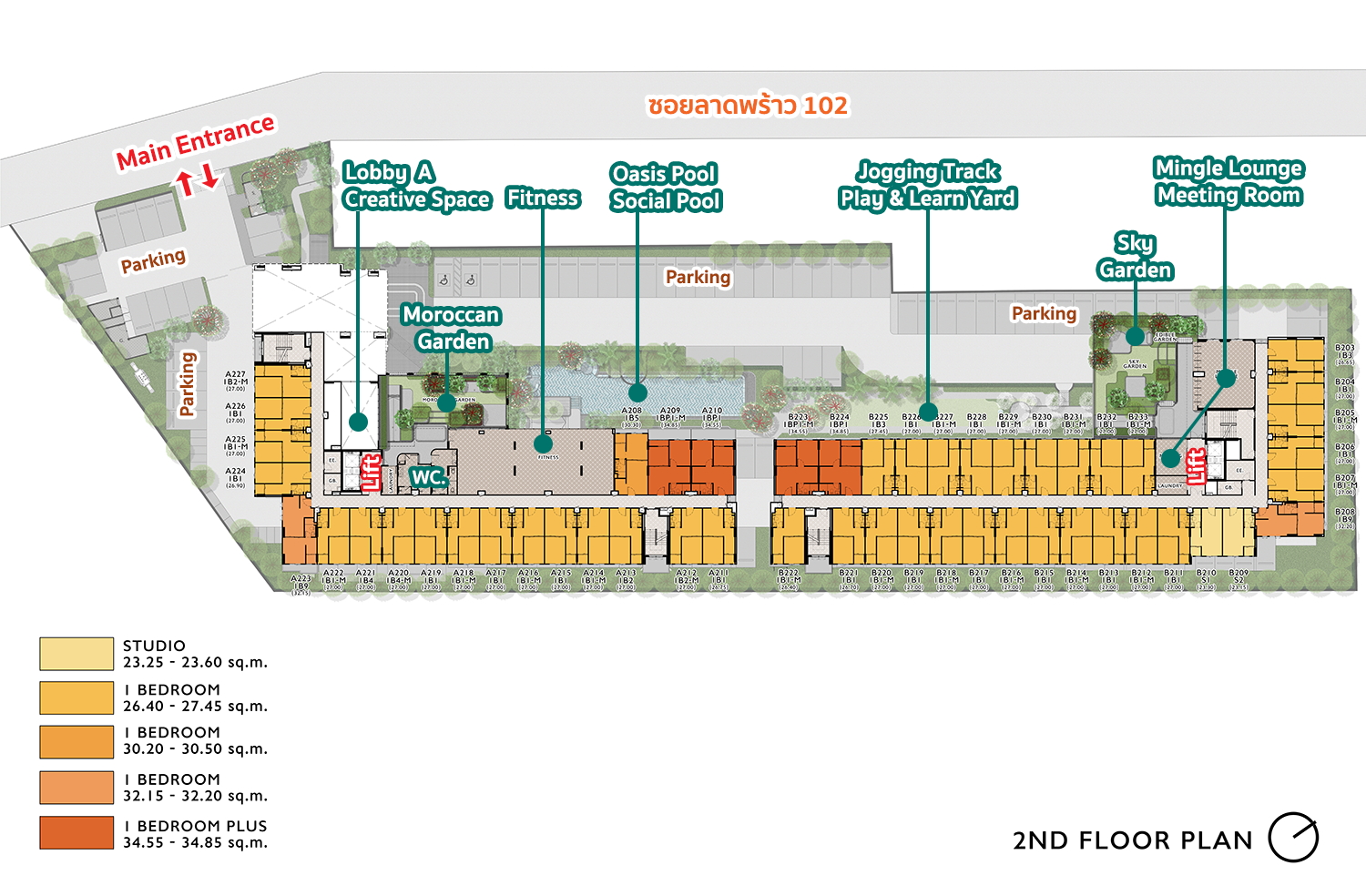 🌳 นอกจากนี้ยังมีพื้นที่สีเขียวให้กระจายตัวอยู่ทั่วโครงการ ทั้ง Play & Learn Yard, Jogging Track, Moroccan Garden และ Sky Garden บนชั้นดาดฟ้า พร้อมระบบรักษาความปลอดภัยครบวงจร 24 ชม. และที่จอดรถ 40% (รวมซ้อนคัน)