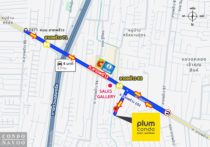 การเดินทางโดยรถส่วนตัว : ทำเลของ Plum Condo East ลาดพร้าว ถือว่ายืดหยุ่นและสะดวกต่อการเข้า-ออกเมืองมาก จากโครงการเพียง 200 ม.* ก็ถึงถนนลาดพร้าวฝั่งขาเข้า ที่เชื่อมได้ทั้งเส้นเลียบด่วนเพื่อขึ้นทางด่วน หรือวิ่งตรงไปยังรัชดาภิเษกและห้าแยกลาดพร้าวบนถนนพหลโยธินได้โดยตรง