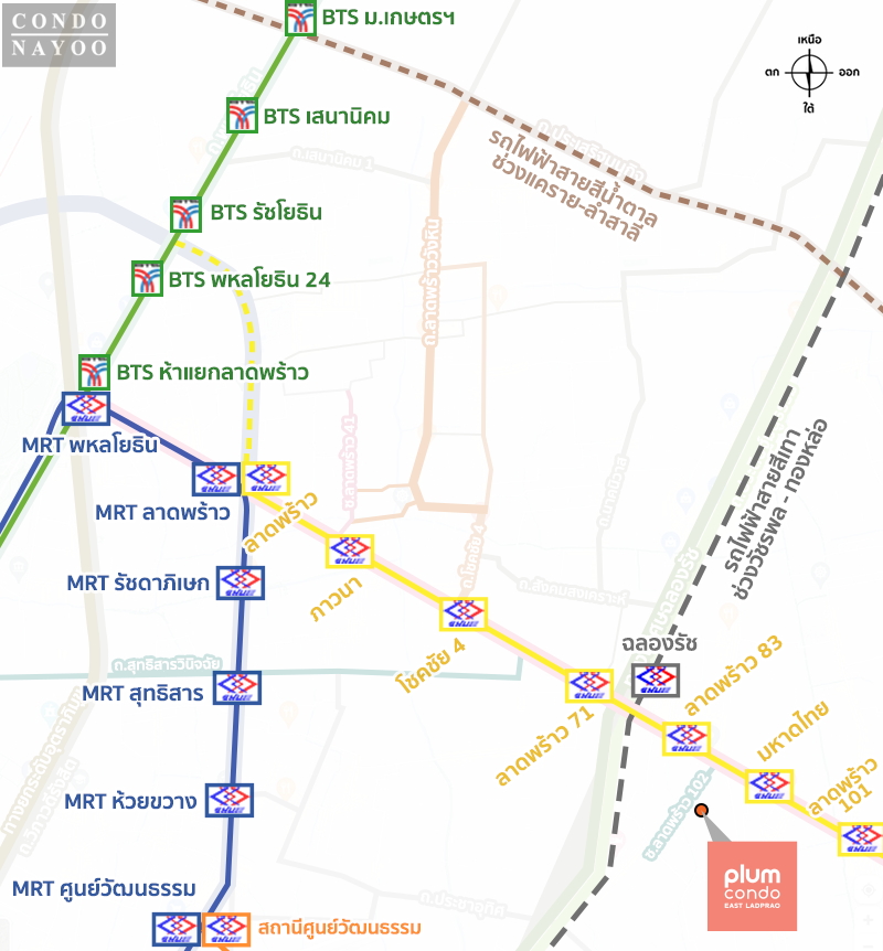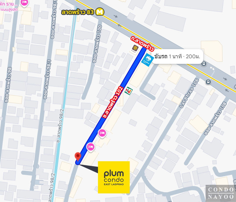 Plum Condo East ลาดพร้าว คอนโดใหม่จาก พฤกษา ที่ซ่อนตัวอยู่ใน ซอยลาดพร้าว 102 เพียง 200 ม.* จากปากซอย และใกล้ MRT สถานีลาดพร้าว 83 แค่ 250 ม.* เดินสบาย ๆ ไม่กี่นาทีก็ถึงรถไฟฟ้า การเดินทางจึงง่ายทั้งต่อเข้า MRT สายสีน้ำเงิน หรือนั่งรถส่วนตัวขึ้นทางด่วนฉลองรัช ด่านประชาอุทิศ และด่านลาดพร้าวได้รวดเร็ว