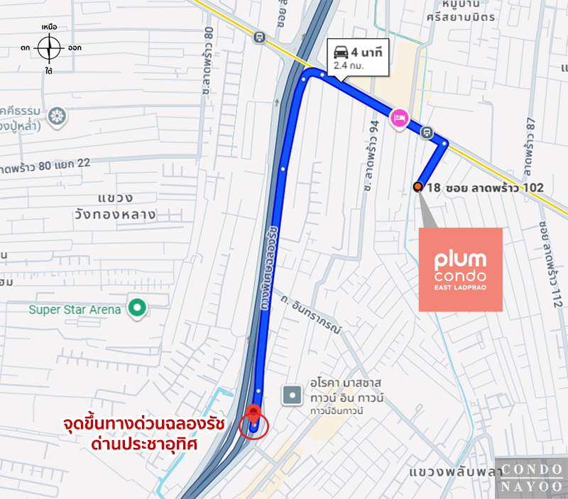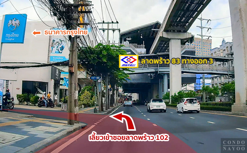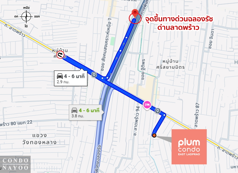 ⇒ การเดินทางโดยรถส่วนตัว : ถือว่าสะดวกมาก เพราะสามารถใช้เชื่อมต่อถนนสายหลักได้หลายเส้น ไม่ว่าจะเป็นถนนลาดพร้าว ถนนรามคำแหง หรือถนนเลียบทางด่วนเอกมัย-รามอินทรา ทำให้สามารถเข้าถึงโซนรัชดา ห้าแยกลาดพร้าว และ New CBD ได้ง่าย อีกทั้งยังมีเส้นทางลัดที่ช่วยเลี่ยงการจราจรในช่วงเวลาเร่งด่วน ทำให้การเดินทางคล่องตัวยิ่งขึ้น