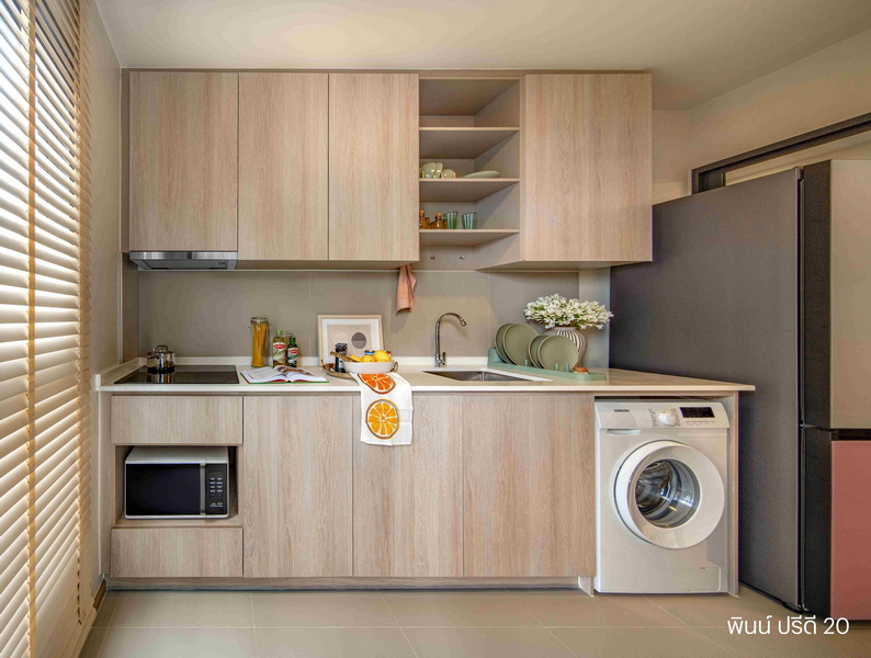 ห้องครัวปิดขนาดกว้างขวาง มีหน้าต่างขนาดใหญ่ใช้เป็นช่องแสงและเปิดระบายกลิ่นควันได้ และมีชุดครัว Built-in พร้อม Hob, Hood, Sink ติดมาให้ครบ ในห้องจะมีการเตรียมงานระบบน้ำ ระบบไฟ เพื่อรองรับการต่อใช้เครื่องซักผ้าได้ด้วย