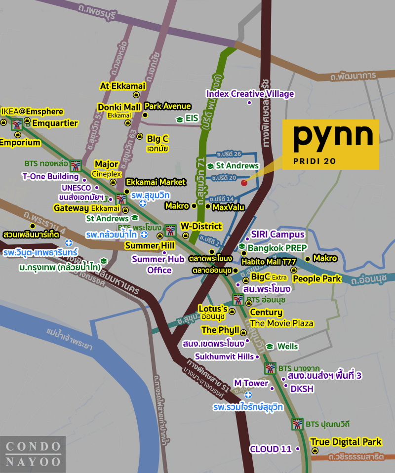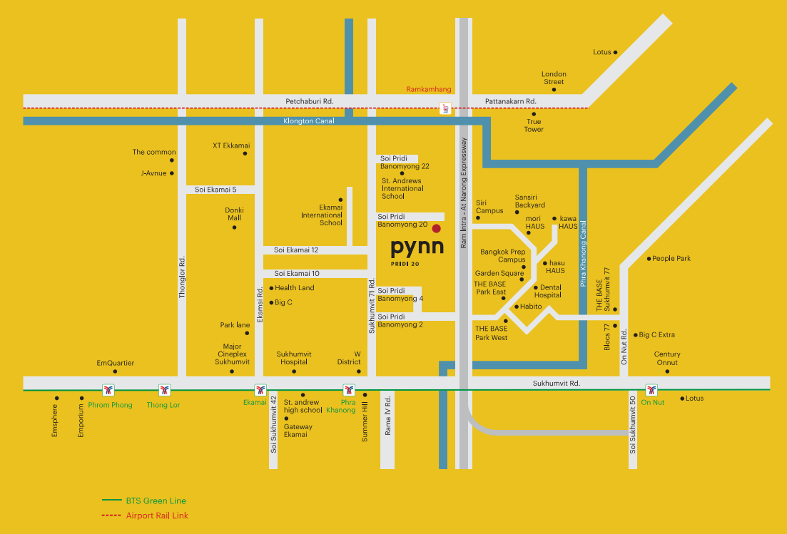 การเดินทางเริ่มจากถนนสุขุมวิท ฝั่งมุ่งหน้าไปแยกพระโขนง ⇒ เลี้ยวเข้าสู่ถนนสุขุมวิท 71 (ปรีดี พนมยงค์) ⇒ ขับตรงไปประมาณ 1.4 กม.* ⇒ เลี้ยวขวาเข้าซอยปรีดี พนมยงค์ 20 ⇒ ตรงไปประมาณ 270 ม.* ⇒ ถึงโครงการ pynn ปรีดี 20 (ตั้งอยู่ทางฝั่งขวามือ)