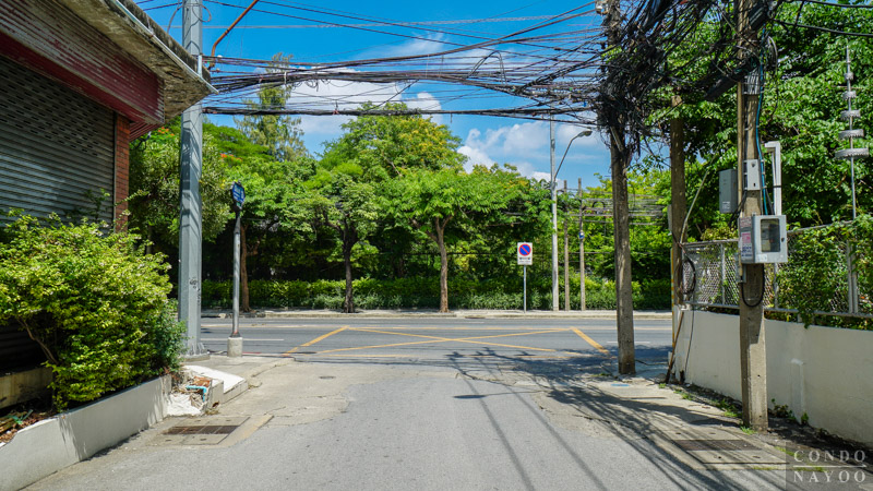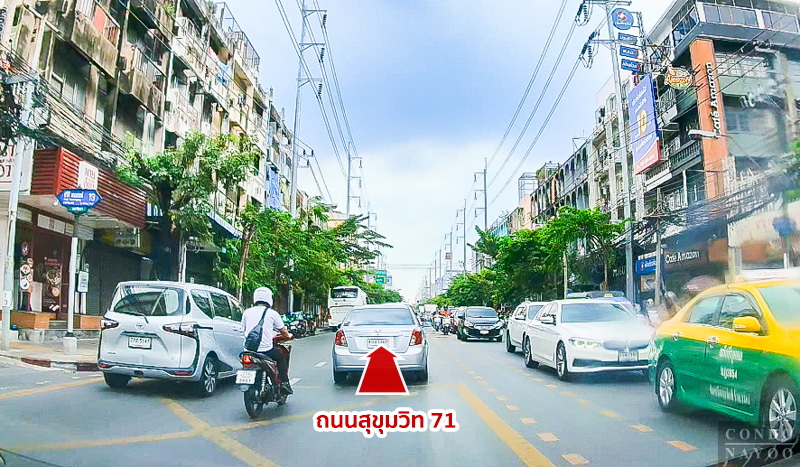 ขับเข้ามาบนถนนสุขุมวิท 71 ช่วงต้น ๆ ซอยจะมีเกาะกลางแบ่งช่องรถเข้า-ออกไว้แบบนี้