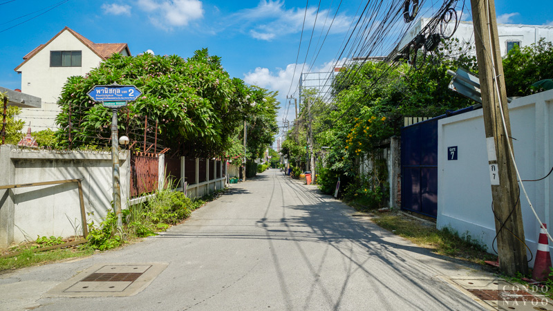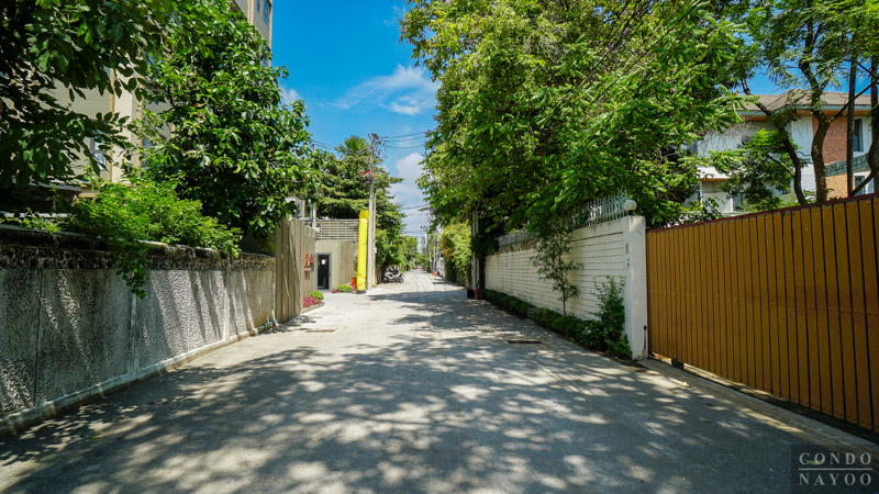 ถัดมาเป็นที่อยู่อาศัยแนวราบเหมือนเดิม หลัก ๆ ในซอยนี้จะเป็นบ้านพักส่วนตัวหลังใหญ่ แต่จะมีบางช่วงที่เป็นตึกแถว 4 ชั้น ที่ส่วนมากจะเป็นบ้านเช่า และมีบางหลังแบ่งเป็นห้องเช่าค่ะ
