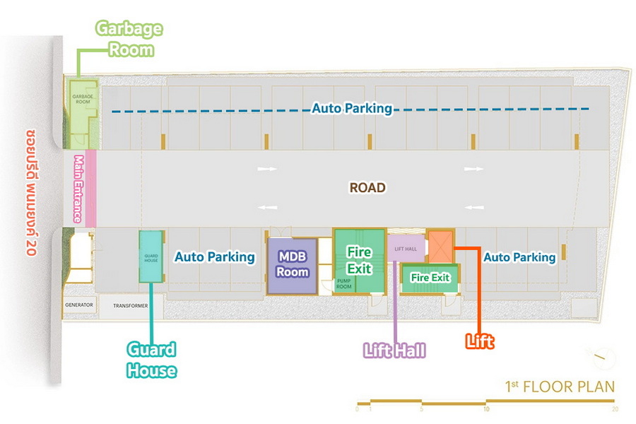 แปลนอาคารชั้น 1 จะเป็นพื้นที่ Public ของโครงการ ทางเข้า-ออกกั้นด้วยประตูรั้วอัตโนมัติ รถยนต์เข้า-ออกผ่านระบบ Easy Pass มีป้อม รปภ. ตั้งอยู่ติดกับประตู ถัดเข้ามาจะเป็นห้องเครื่อง บันไดหนีไฟ และโถงลิฟต์ ที่มีลิฟต์โดยสารให้ 1 ตัว ส่วนพื้นที่ตรงกลางจะเป็นถนนเมน และส่วนที่เหลือจะเป็นที่จอดรถแบบลิฟต์จอดรถยนต์ คิดเป็น 94% ของจำนวนยูนิต