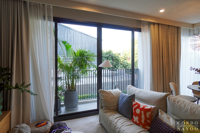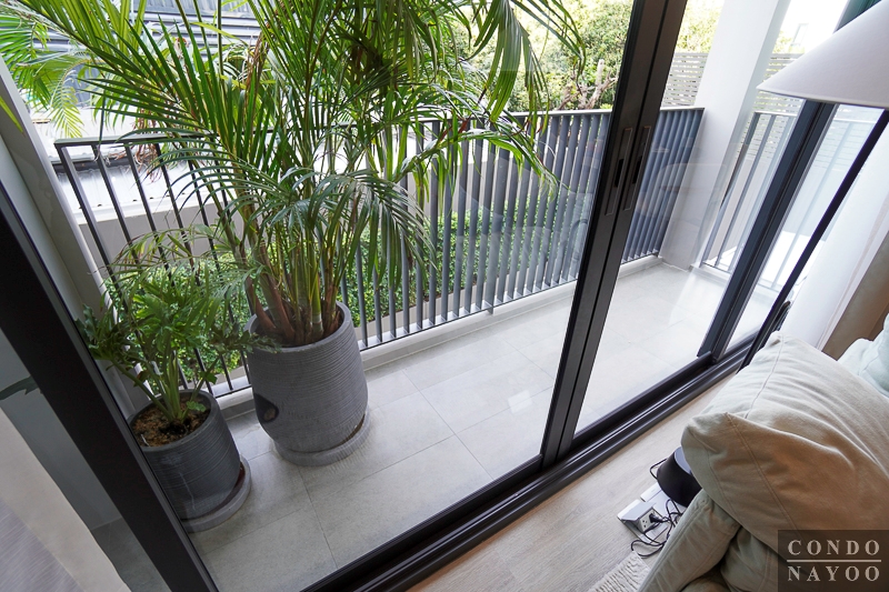 ส่วนพื้นที่ระเบียงของห้องจะมีหน้ากว้างมากขึ้น สามารถจัดเป็นสวนกระถางเพื่อสร้างวิวให้กับห้อง และยังเปิดบานเลื่อนได้กว้างเพื่อรับลมและเชื่อมต่อพื้นที่ Indoor และ Outdoor