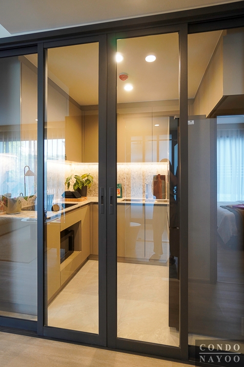 สำหรับห้องครัวเราได้เป็นครัวปิด มีการกั้นส่วนด้วยประตูบานเลื่อนกระจกกรอบอะลูมิเนียมเพื่อช่วยกันกลิ่นในการปรุงอาหาร