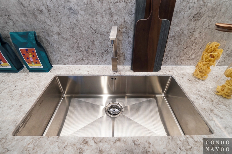 มีอ่างล้างมือฝังบนเคาน์เตอร์สำหรับรูปขนาดใหญ่ Top อ่างเป็น Solid Surface ลายหินธรรมชาติ มีพื้นที่สำหรับวางขวดสบู่และกระถางต้นไม้ตกแต่งได้ ใต้ตู้มีพื้นที่ให้เก็บของได้ด้วย