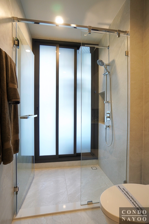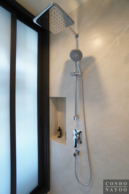 ด้านในเป็นโซน Shower ที่มี Shower Screen เป็น Tempered Glass ติดตั้งมาให้เรียบร้อยแล้ว พื้นที่อาบน้ำด้านในก็มีขนาดกำลังดี มีชุด Rain Shower และ Hand Shower พร้อมช่องสำหรับวางของ