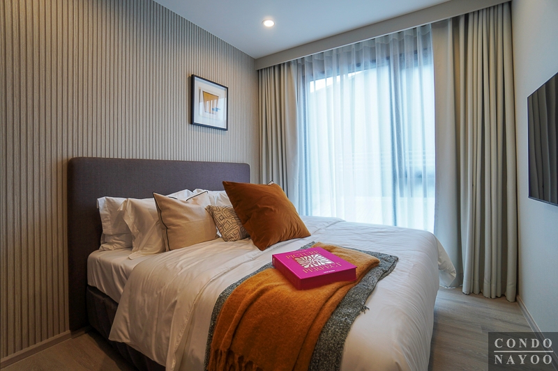 ส่วน Master Bedroom จะได้พื้นที่ห้องมาขนาดใหญ่พิเศษ วางเตียงนอน 6 ฟุต, โต๊ะหัวเตียง และชั้นวางทีวีฝั่งปลายเตียงก็ยังเหลือพื้นที่เป็นทางเดินกว้าง ๆ ยังเพิ่มอาร์มแชร์เป็นมุมนั่งเล่นติดหน้าต่างด้วยก็ทำได้ลงตัว