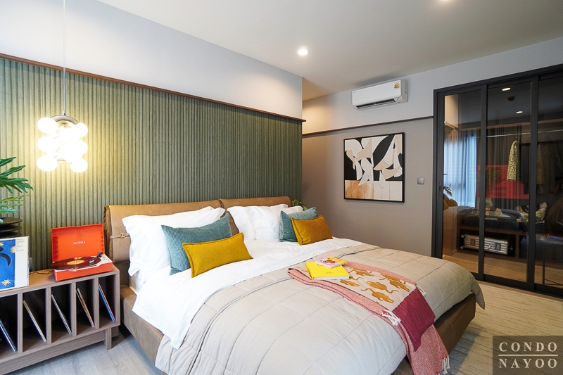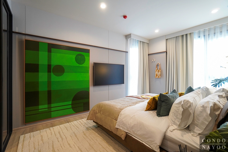 ส่วน Master Bedroom จะมีพื้นที่ขนาดใหญ่ขึ้นไปอีก ห้องตัวอย่างวางเตียง 6 ฟุตกับโต๊ะหัวเตียง 2 ฝั่งก็ยังได้พื้นที่แบบสบาย ๆ เลยค่ะ ฝั่งปลายเตียงยังเพิ่มทีวีแบบแขวนผนังได้นะคะถ้าชอบดูทีวีตอนก่อนนอน