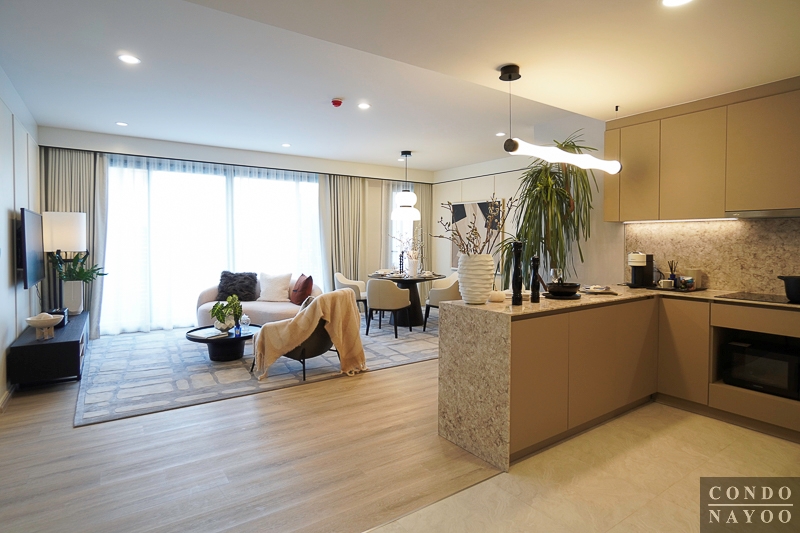 ส่วนวัสดุที่ทางโครงการเลือกใช้ก็ได้แบบพรีเมียม ทำให้ห้องดูสวยแบบเรียบหรู ตกแต่งให้แบบ Fully Fitted พื้นห้องปูด้วย SPC ลายไม้หนา 5.5 มม. พื้นห้องครัวและพื้นห้องน้ำปูด้วยกระเบื้องพอร์ซเลนลายหินธรรมชาติขนาด 60 x 60 ซม. ภายในห้องครัวได้เคาน์เตอร์ครัวขนาดใหญ่พร้อมชุดครัว MEX ห้องน้ำได้สุขภัณฑ์แบรนด์ Kohler และ Englefield ถ้าเป็นห้อง Master Bedroom และ Powder Room จะได้โถสุขภัณฑ์แบบอัตโนมัติ ส่วนเครื่องปรับอากาศบริเวณ Living & Dining Area เป็นแบบ Conceal Type ส่วนห้องนอนเป็นแบบ Wall Type ค่ะ