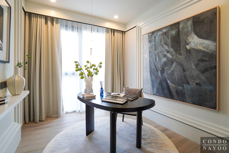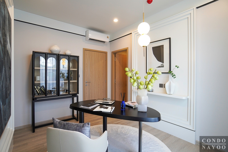 ภายในห้องนอนรองถือว่าได้พื้นที่มาขนาดกำลังดี เป็นห้องที่วางเตียง 5 ฟุต, โต๊ะเขียนหนังสือ และตู้เสื้อผ้าขนาดมาตรฐานได้ลงตัว นอกจากนี้ก็ยังใช้เป็นห้องอเนกประสงค์ได้ด้วยนะคะ ที่ห้องตัวอย่างนี้ตกแต่งมาเป็นห้องทำงานส่วนตัว