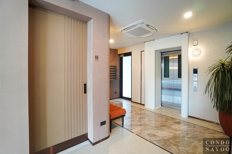 ภายใน Lift Lobby ถูกออกแบบให้เป็น Welcome Space ตกแต่งดูสวยงามและอบอุ่น ภายในห้องนี้จะมีม้านั่งพักคอย Mail Box ก็จะอยู่ภายในห้องนี้ด้วย สังเกตว่าด้านข้าง Mail Box จะมีประตูเปิดออกไปทางบันไดหนีไฟได้ ในกรณีที่ลิฟต์หยุดให้บริการจากการซ่อมบำรุง เราก็สามารถใช้บันไดหนีไฟเดินขึ้นห้องของตัวเองได้ โดยการเข้า-ออกทุกจุดรวมไปถึงการใช้งานลิฟต์จะใช้ระบบ Face Scan ทั้งหมดเช่นกันค่ะ