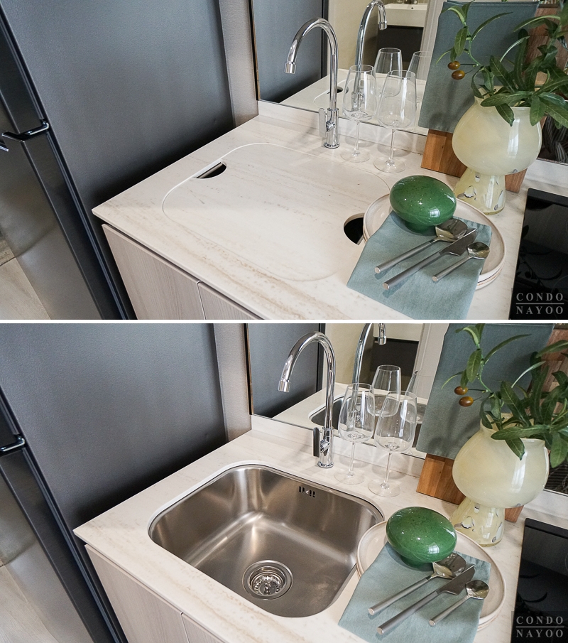 ได้ Sink ล้างจานหลุมเดี่ยว ก๊อกน้ำก้านโยกทรงสูง ที่มีหน้าบานปิด Sink ให้เหมือนกันทุกยูนิต ผนังตรง Backsplash ได้ Smart Plug มา 1 จุด