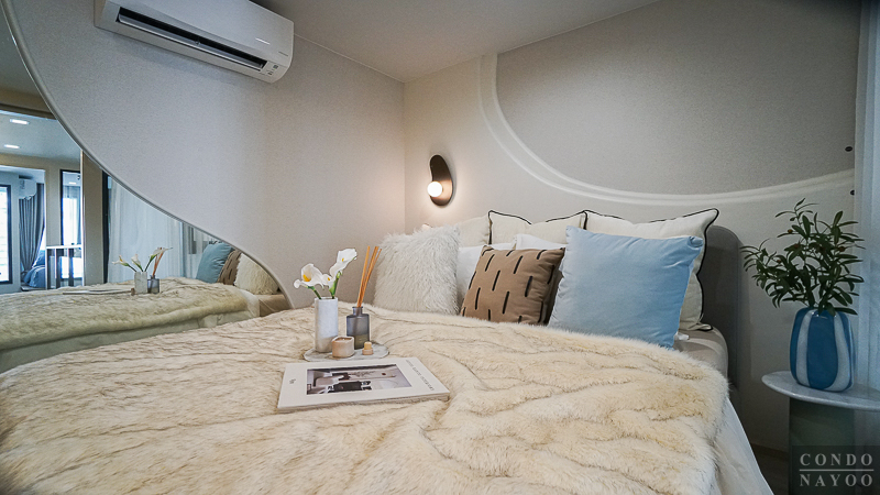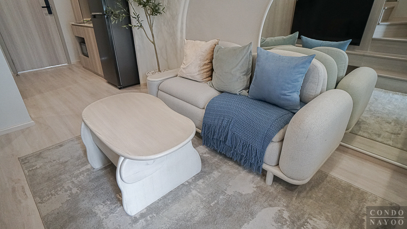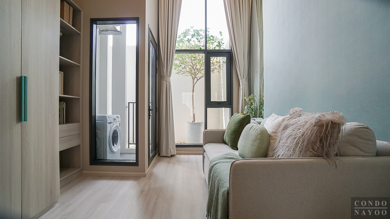 เปิดประตุเข้ามาภายในห้องจะเจอกับห้องครัวเปิดและห้องน้ำ ต่อเนื่องไปเป็น Living Area และระเบียงซักล้าง ที่วางผังมาคล้าย ๆ กันกับห้องตัวอย่างแบบ 2 Beds ที่พาไปชมก่อนหน้านี้ ส่วนวัสดุมาตรฐานภายในห้องจะได้มาเหมือนกันทั้งโครงการ คือ พื้น SPC ลายไม้, ไฟ Led Panel, ผนังฉาบเรียบทาสี พร้อมเฟอร์นิเจอร์แบบ Fully Furnished ดีไซน์พิเศษจาก THINKK Studio