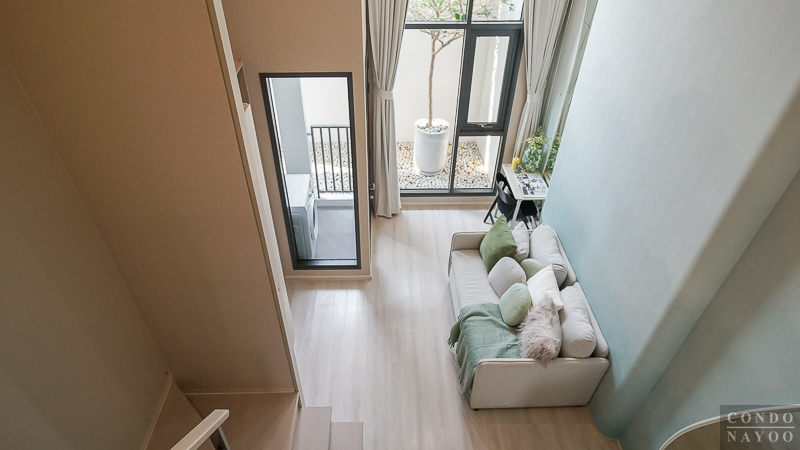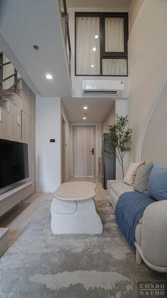 มองกลับออกมาทางด้านหน้าห้อง จะเห็น Living Area และห้องนอนบนชั้นลอย ผนังตรงกลางติดแอร์ Wall Type ไว้ให้ด้วย 1 ตัวค่ะ
