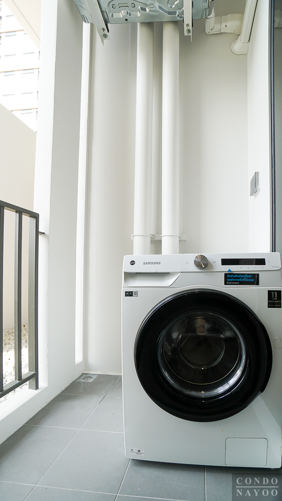 ด้านนอกเป็นระเบียงซักล้าง ที่ปูพื้นกระเบื้องเซรามิกกันลื่นให้เต็มพื้นที่ และมีการเดินงานระบบน้ำ-ไฟให้แล้ว สามารถต่อใช้เครื่องซักผ้าได้เลยค่ะ