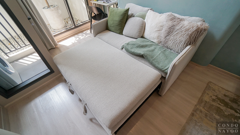 ได้โซฟาเบด 3.5 ฟุต ซึ่งมุมนี้จะสามารถกั้นเป็นห้องนอนชั้นล่างได้เหมือนกัน