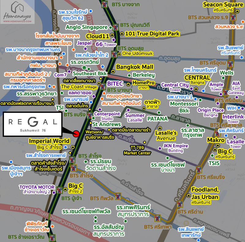 | จุดเด่นของโครงการ | Regal Sukhumvit 76 โครงการทำเลทอง คอนโดหรู มีห้างฯ Shopping Mall ระดับ High-End สะดวกสบาย ใกล้ BTS 2 สาย ส่วนกลางมาตรฐานโรงแรม 5 ดาว |