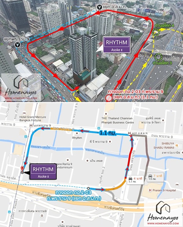 การเดินทางเราเริ่มจากแยกอโศก-เพชรบุรี ⇒ ถนนอโศก-ดินแดง ⇒ แยกพระราม 9 ⇒ ถ.พระราม 9 ⇒ แยก อ.ส.ม.ท. ⇒ กลับรถ ⇒ แยกพระราม 9 ⇒ 180 ม.⇒ ริทึ่ม อโศก 2 *ติดทางด่วนขั้นที่ 2 และใกล้แยกพระราม 9