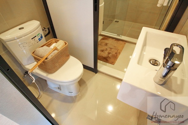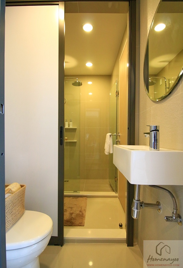 เปิดประตูเข้ามา เปิดประตูเข้ามา..จะเจอกับห้องน้ำแบบ Powder room ก่อน พื้นห้องน้ำ และผนังห้องน้ำ ปูกระเบื้องแกรนิตโต้ 60 x 60 ซม. มีประตูบานเลื่อนกั้นอีกชั้น ก่อนจะเข้าสู่ห้องอาบน้ำ