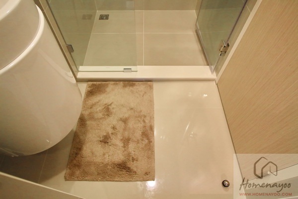 ถัดเข้าไปด้านในสุด เป็นส่วนอาบน้ำ ทางโครงการกั้นฉากอาบน้ำกระจกนิรภัย มือจับโครเมียมตัว U แขวนผ้าเช็ดตัวได้ ยกธรณีสูง 5 ซม. เพื่อกั้นระหว่างพื้นส่วนอาบน้ำ และส่วนแห้ง
