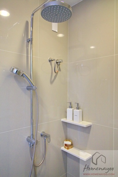 ฝักบัวโครเมียมแบบ Rain Shower + Hand Shower พร้อมราวปรับระดับของ Grohe ผนังมีชั้นวางอุปกรณ์อาบน้ำ และ ที่วางสบู่ พร้อมเดินงานระบบรองรับการติดตั้งเครื่องทำอุ่นไว้ให้ พร้อมใช้งานได้เลย