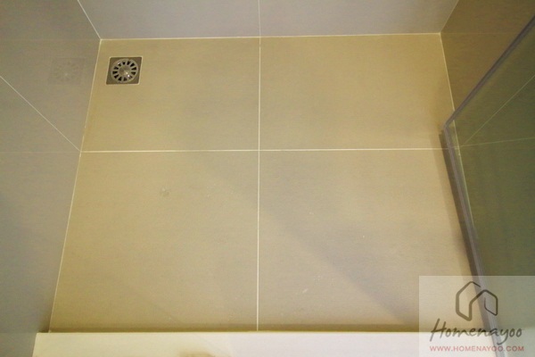 พื้นส่วนอาบน้ำปูกระเบื้องเซรามิคกันลื่น 60×60 ซม. ส่วนพื้นที่ใช้งาน ขนาด 0.80 x 1.05 เมตร ยืนอาบน้ำได้สบายๆ ไม่อึดอัด