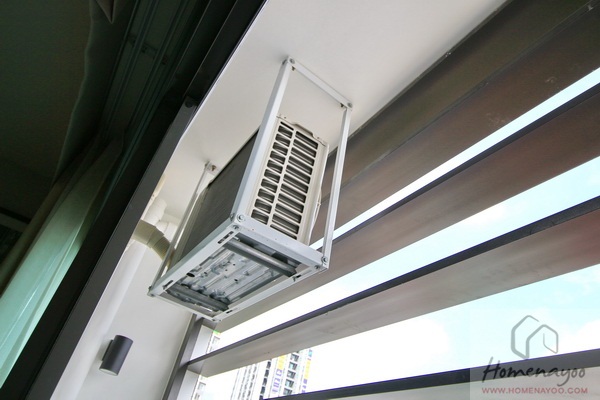เปิดหน้าต่างบานเลื่อนออกมา จะเจอกับระเบียงสำหรับวางคอมเพรสเซอร์แอร์ ปล่อยลมร้อนออกสู่นอกอาคาร ซ้ายมือติดตั้งก๊อกสนาม พร้อมเจาะท่อน้ำทิ้งเอาไว้ให้เรียบร้อยค่ะ