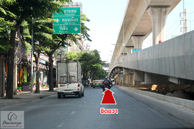 ลงสะพานมาก็จะผ่าน BTS รัชโยธินเพื่อให้เบี่ยงซ้ายไม่ต้องขึ้นสะพานข้ามแยกเสนานิคม