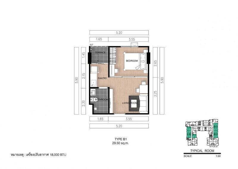 แปลนห้องพัก 1 Bedroom : Type B1 ขนาด 29.50 ตร.ม.