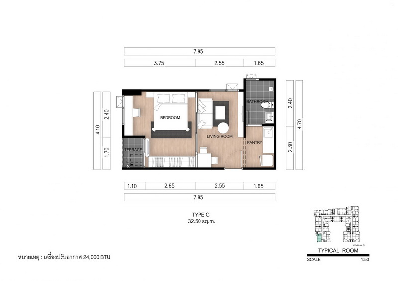 แปลนห้องพัก 1 Bedroom : Type C ขนาด 32.50 ตร.ม.