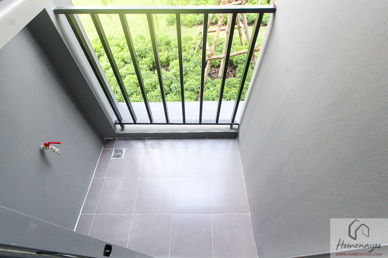 ส่วนพื้นที่บริเวณระเบียงระมีขนาดพอให้วางราวตากผ้าขนาดไม่ใหญ่มากได้ และมีเดินระบบสำหรับติดตั้งเครื่องซักผ้ามาให้เรียบร้อย