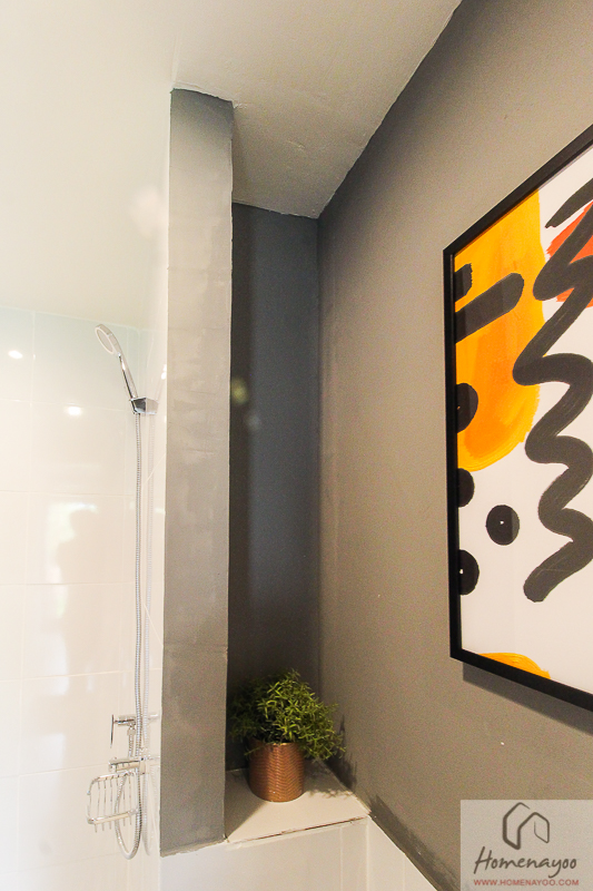 ในโซนอาบน้ำจะแยกพื้นที่มาให้เรียบร้อย ด้วยธรณีก่อสูงขึ้นมาเพื่อกันน้ำไหลย้อนไปโซนแห้ง ตรงนี้จะไม่มีฉากกั้นอาบน้ำมาให้ แต่เราก็สามารถติดตั้งเพิ่มเองได้ไม่ยากค่ะ