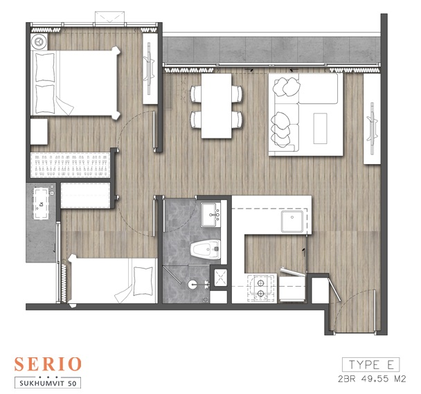 TYPE E1 : 2 Bedrooms ขนาด 49.55 ตร.ม.