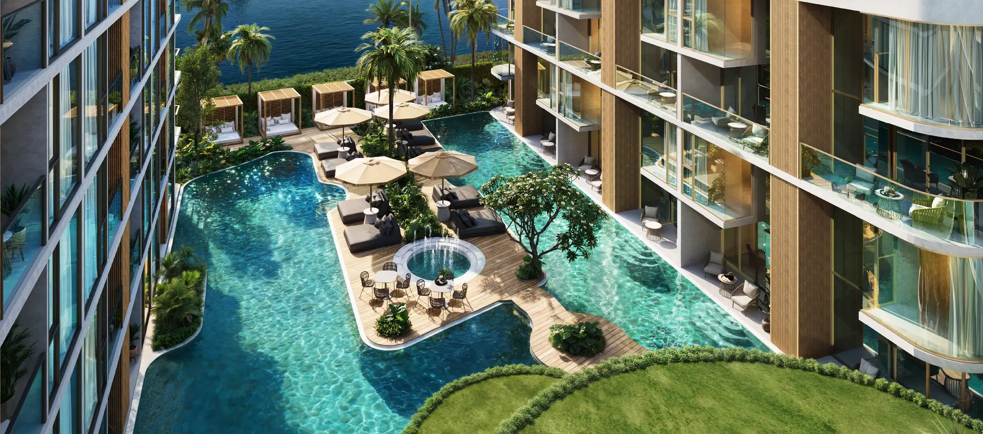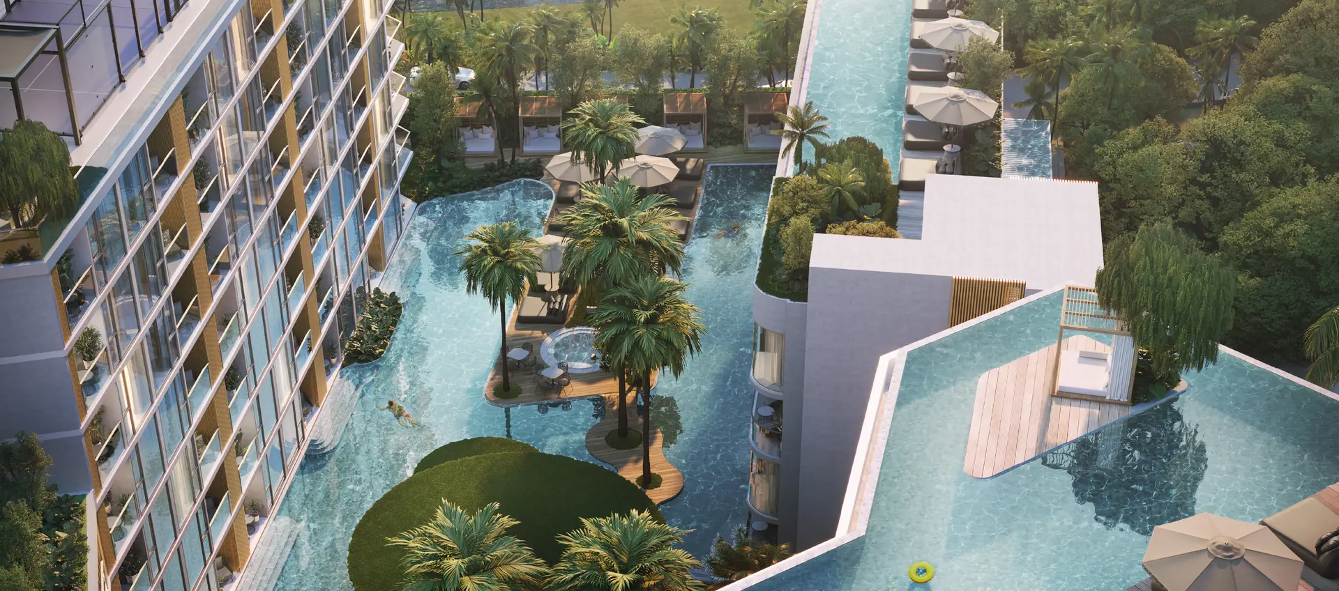 ภาพและบรรยากาศจำลองอาคารพักอาศัย และสระว่ายน้ำ