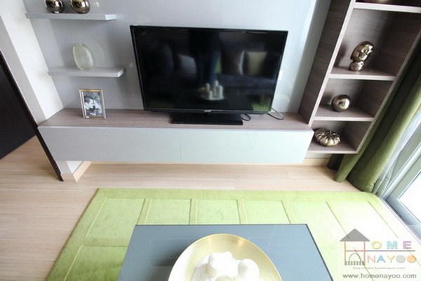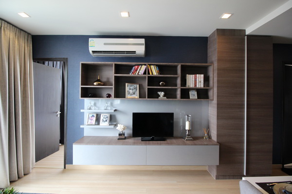 ส่วนนั่งเล่นวางโซฟาขนาด 3-4 ที่นั่ง ตรงข้ามบิวท์อินเป็นชั้นวางทีวี ระยะห่างโซฟา – ทีวีประมาณ 1.50 เมตร เดินเข้า-ออก ได้สบายๆ ค่ะ