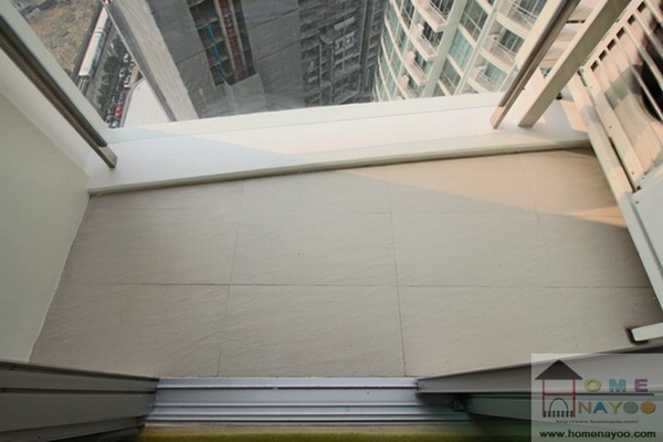 ระเบียงห้องปูพื้นกระเบื้องเซรามิค พื้นที่ระเบียงห้องจะดูเอียง ๆ หน่อยนะค่ะ ขนาดระเบียง 2.70×90 ซม. ค่ะ