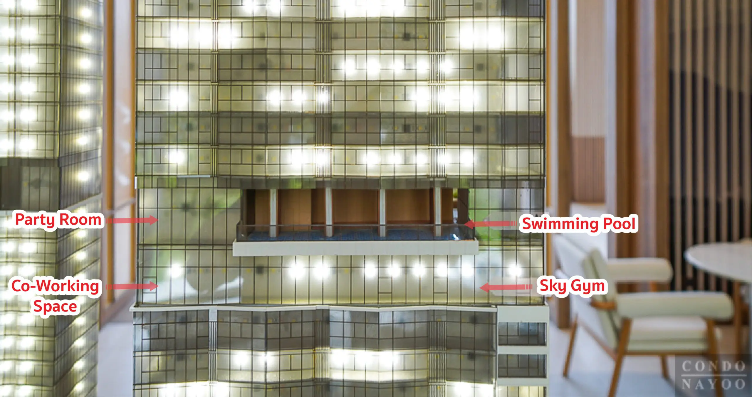 ที่ชั้น 49 อาคาร A มี Swimming Pool ที่ยื่นออกนอกแนวตัวอาคารมองเห็นวิวทะเลได้แบบเต็มตา และมี Party Room กับ Sky Garden