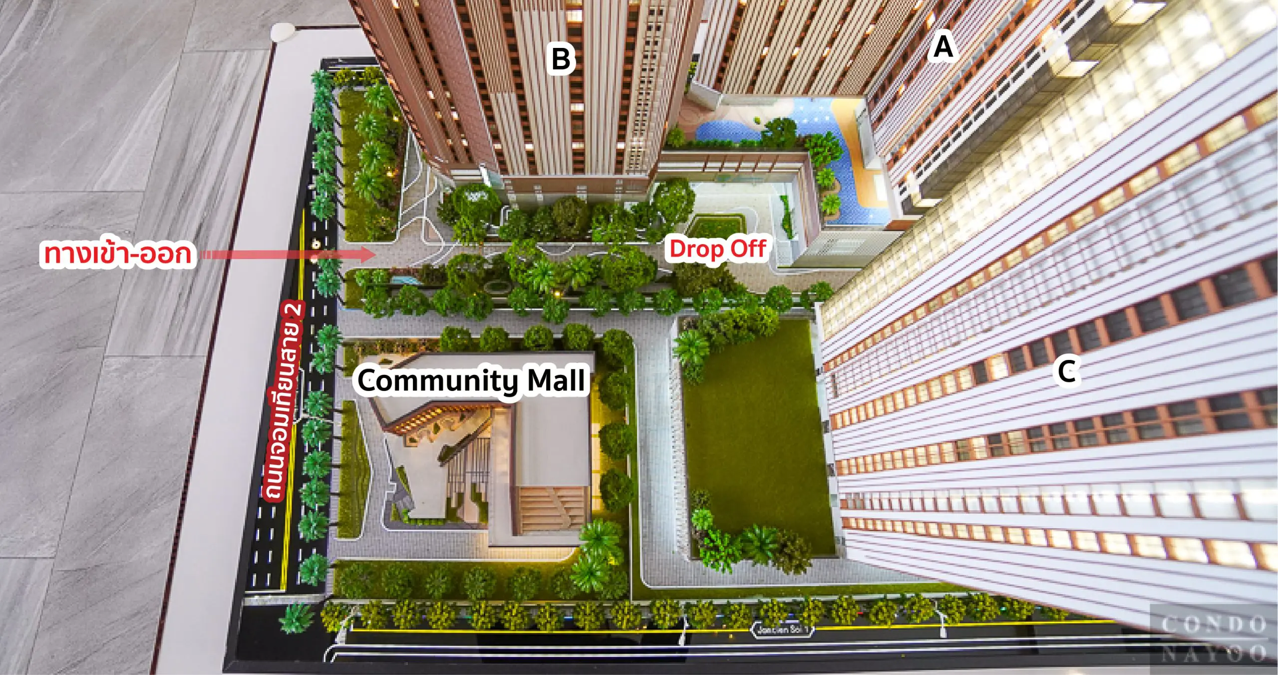 ทางเข้าออกโครงการจะแยกกันระหว่าง เฟส 1 คืออาคาร A, B ส่วนเฟส 2 คืออาคาร C ตรงด้านหน้าอาคาร C จะมี Community Mall