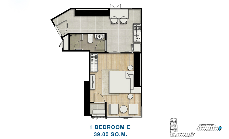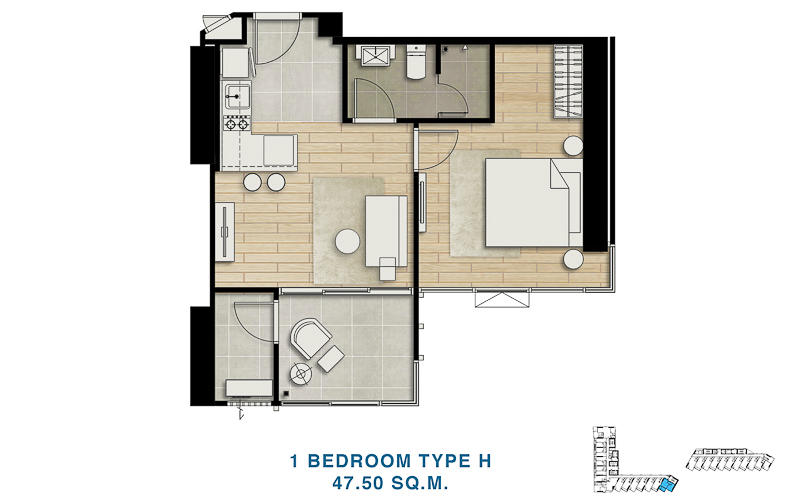 ห้อง Studio Type A ขนาด 28 ตร.ม. พื้นที่ภายในห้องกว้างเปิดโล่งเชื่อมต่อกัน ห้องครัวขนาดกำลังดี ห้องนอนและห้องนั่งเล่นใช้งานร่วมกัน พื้นที่ขนาดใหญ่จัดวางเฟอร์นิเจอร์ได้ง่าย ได้ระเบียงแบบปิด Double Balcony ทำเป็นพื้นที่นั่งพักผ่อนได้