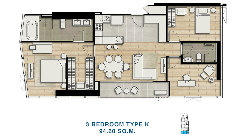 2 Bedroom Type J ขนาด 86.00 ตร.ม. จุดเด่นของห้องนี้ ได้แปลนห้องหน้ากว้างฟังก์ชันภายในแบ่งเป็นสัดส่วน ได้ห้องนั่งเล่น ส่วนรับประทานอาหาร และระเบียงขนาดใหญ่ ห้องนอนมี Walk-in closet และห้องน้ำในตัวพร้อมอ่างอาบน้ำ ตำแหน่งห้องนี้จะอยู่มุมอาคาร A ผนังห้องจะติดห้องอื่นแค่ฝั่งเดียว