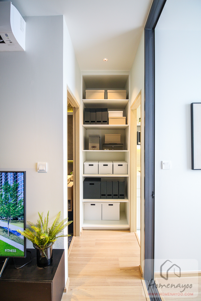 มองกลับมาทางหน้าห้อง จะเจอกับพื้นที่โซนครัวที่กว้างถึง 1.8 ม. ซึ่งเป็นระยะที่ใช้งานได้สะดวกมาก สามารถยืนทำอาหาร ล้างจาน เปิดตู้เย็น หรือใช้งานเครื่องซักผ้า รวมถึงเดินเข้า-ออกห้องโดยไม่ติดขัดพื้นที่รอบ ๆ เลยค่ะ