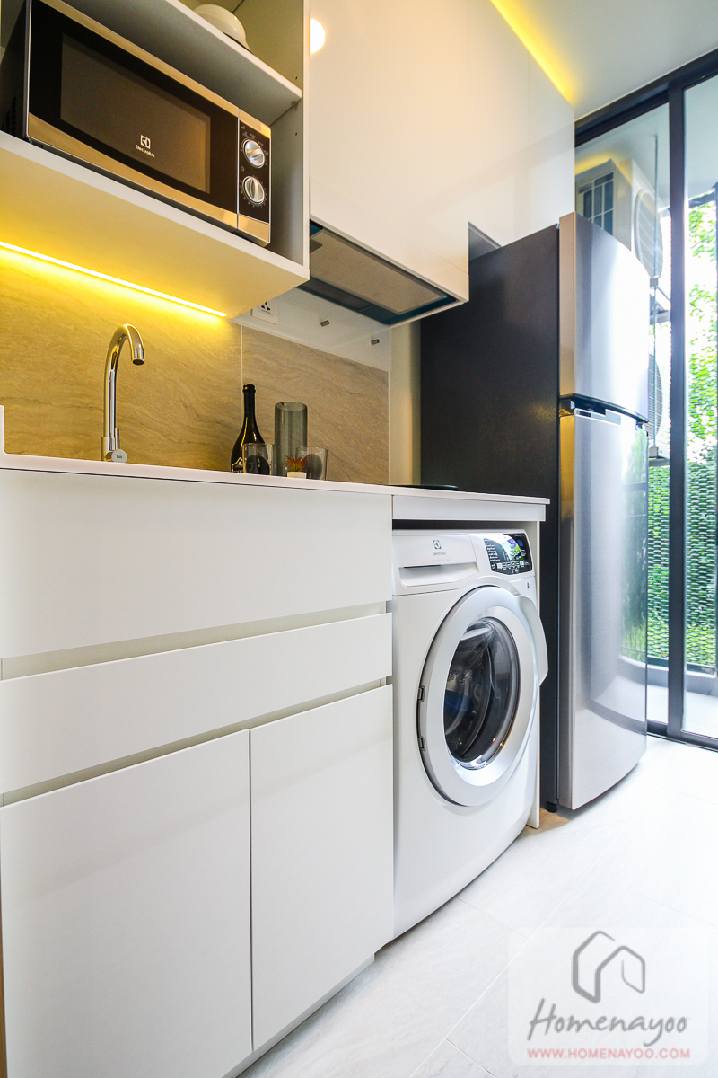 ด้านล่างมีทั้งตู้เก็บของ ลิ้นชัก และช่องสำหรับวางเครื่องซักผ้าฝาหน้า ขนาด 7-10 กก. ซึ่งโครงการเดินระบบไฟและน้ำไว้ให้พร้อมใช้งานแล้ว