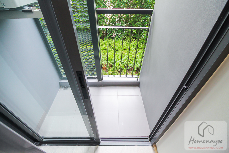 ติดกับโซน Common Area จะเป็นประตูทางออกสู่ระเบียงพักผ่อนด้านนอก ตัวประตูเป็นบานเลื่อน กรอบอะลูมิเนียมสีดำ มาพร้อมกระจกตัดแสงที่ช่วยกรองแสงแดดและความร้อนจากภายนอก เพิ่มความสบายในการอยู่อาศัย