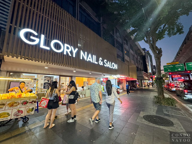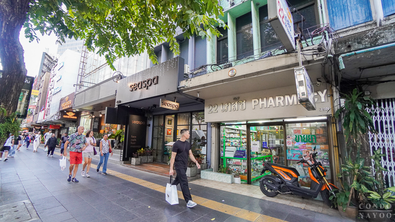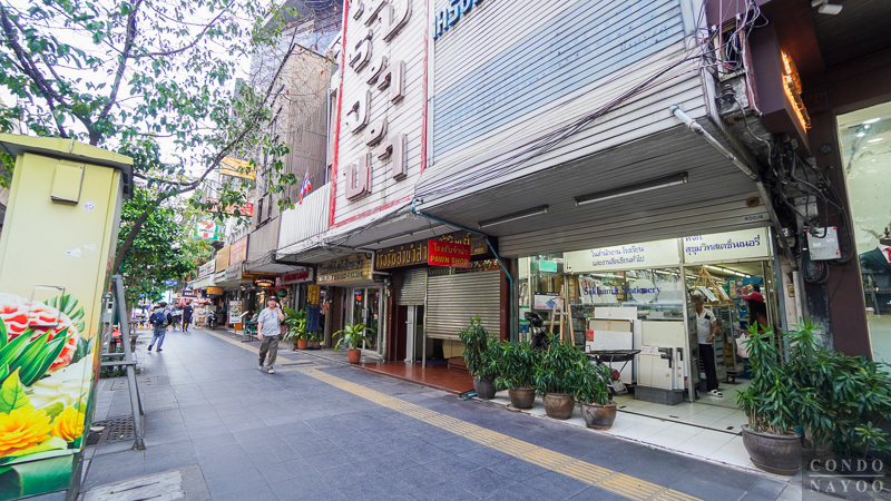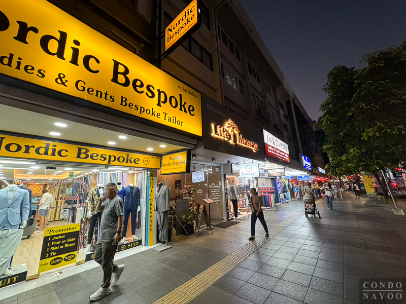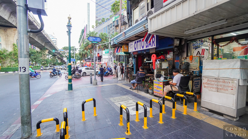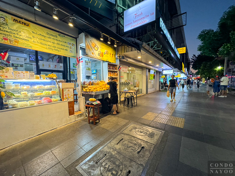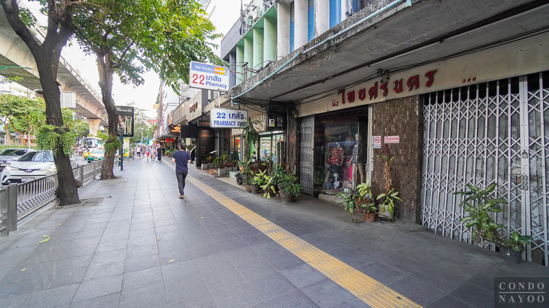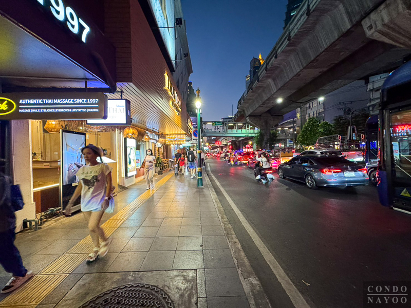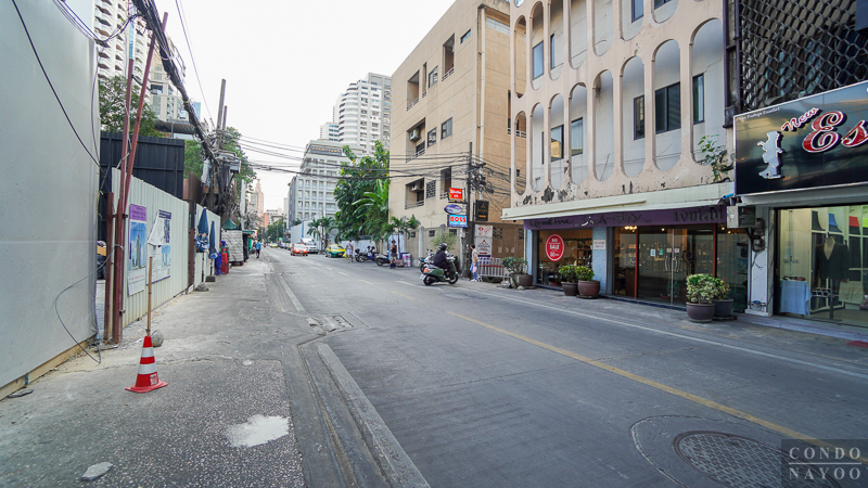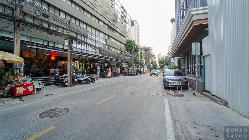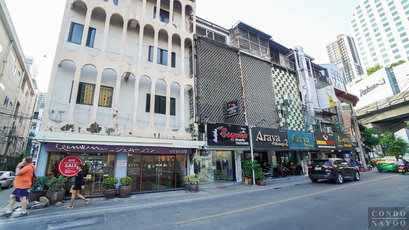 เดินตรงไปทางแยกอโศก ริมถนนช่วงนี้จะเป็นตึกแถวเหมือนฝั่งทางไปแยกสายน้ำผึ้ง แต่ด้านนี้จะเปิดเป็นคาเฟ่ ร้านนวดสปา ร้านเสริมสวย และมีร้านตัดสูทเปิดอยู่เยอะ